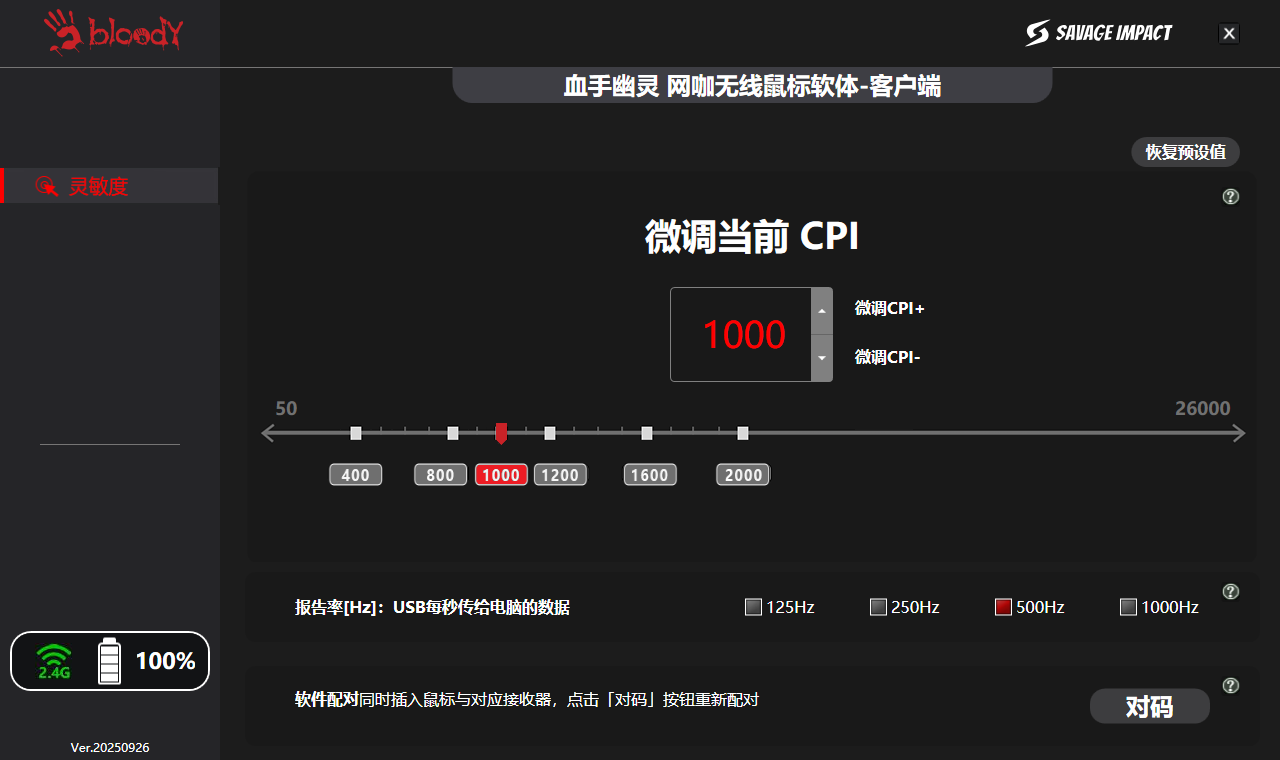 1. 支持无线鼠标一代升级无线鼠标二代后,适配软件的CPI与报告率设置。